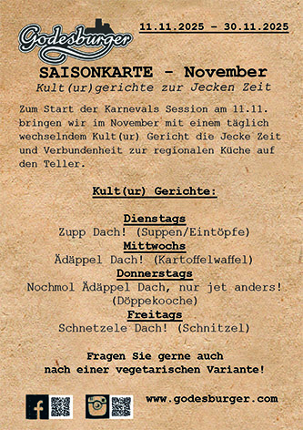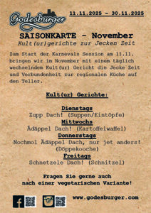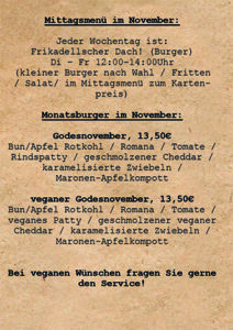 Im November ist jeder Tag „𝐅𝐫𝐢𝐤𝐚𝐝𝐞𝐥𝐥𝐬𝐜𝐡𝐞𝐫 𝐃𝐚𝐜𝐡“, dass heißt, ihr bekommt von Di – Fr 12:00-14:00Uhr einen kleinen Burger nach Wahl mit Fritten und Salat im Mittagsmenü zum Kartenpreis